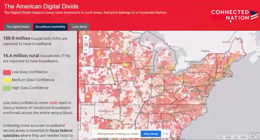 Frederick began by displaying a graphic showcasing areas in which Connected Nation had low confidence in broadband connectivity reports — which included almost all supposedly connected regions.