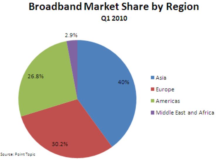 WASHINGTON, June 21, 2010 – Late last week at the CommunicAsia conference in Singapore, Broadband Forum in conjunction with data from Point Topic GBS released a report on the state of global broadband. According to the report there are currently 484 broadband lines globally. It is important to note that the firm does not specific what speeds it considers broadband but it does include all current forms of internet connectivity both wired and wireless including satellite.
