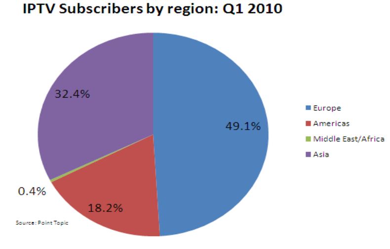 In addition to broadband the report also looked at the current state of IPTV. They project 36.6 million IPTV subscribers globally, with represents a growth of nearly 8% over the past quarter. The service is the most popular in France which has nearly 9 million subscribers, in contrast the United States which has the second highest subscriber rate only has 6 million subscribers; however Asia is gaining in subscribers.