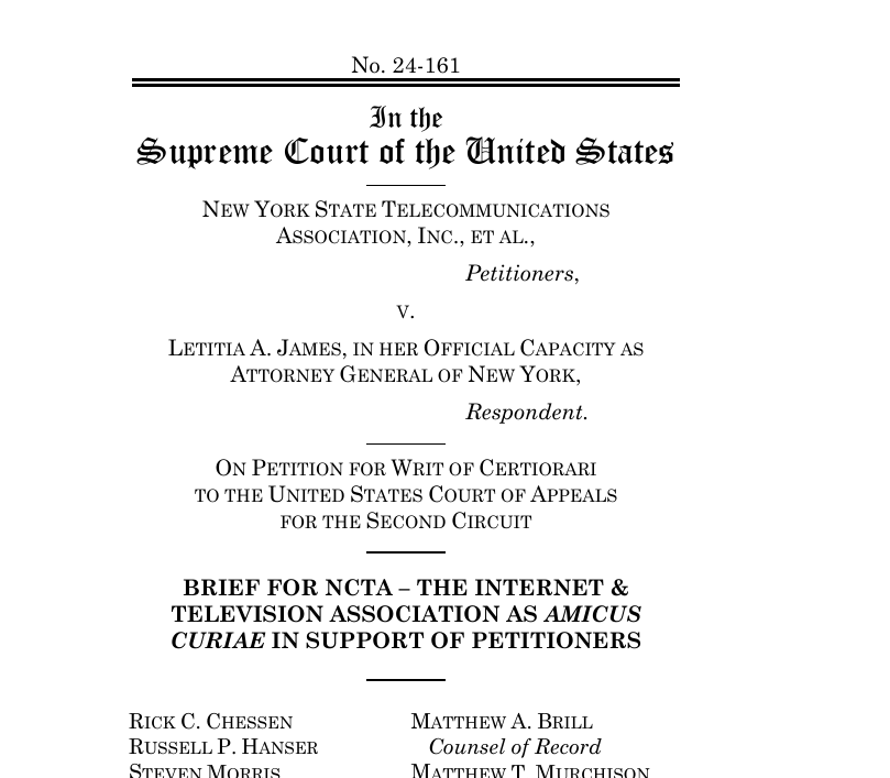 “The fundamental issue is that New York’s attempt at rate regulation conflicts with the Communications Act itself,” NCTA, the cable industry group, wrote in an amicus brief posted Friday. “Regardless of what the FCC decides to do (or not do), that statute is clear, and the states cannot subvert congressional intent by treating broadband providers as rate-regulated common carriers.”