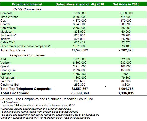 According to the data, cable companies added 2.3 million new subscribers while telephone companies added only 1.1 million. At the end of 2010, Leichtman calculated 75 million broadband subscribers.