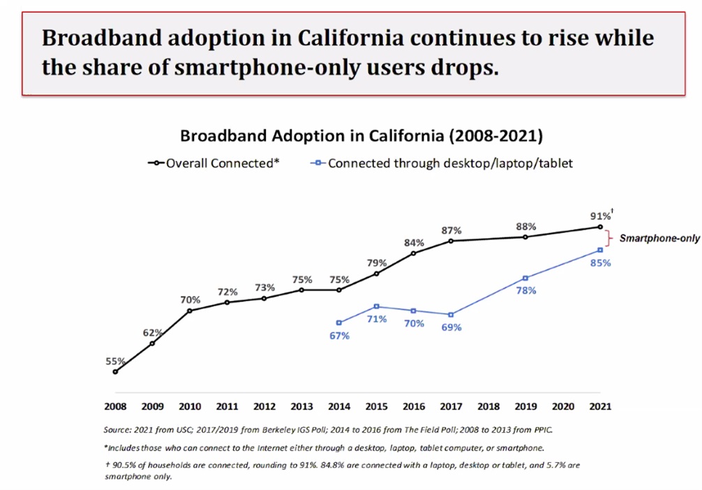 April 5, 2021 – A new survey released late last month suggests Californians are adopting more devices as smartphone-only connections in the state continue to drop. The California Emerging Technology Fund, a non-profit foundation focused on digital equity in the state, and the University of Southern