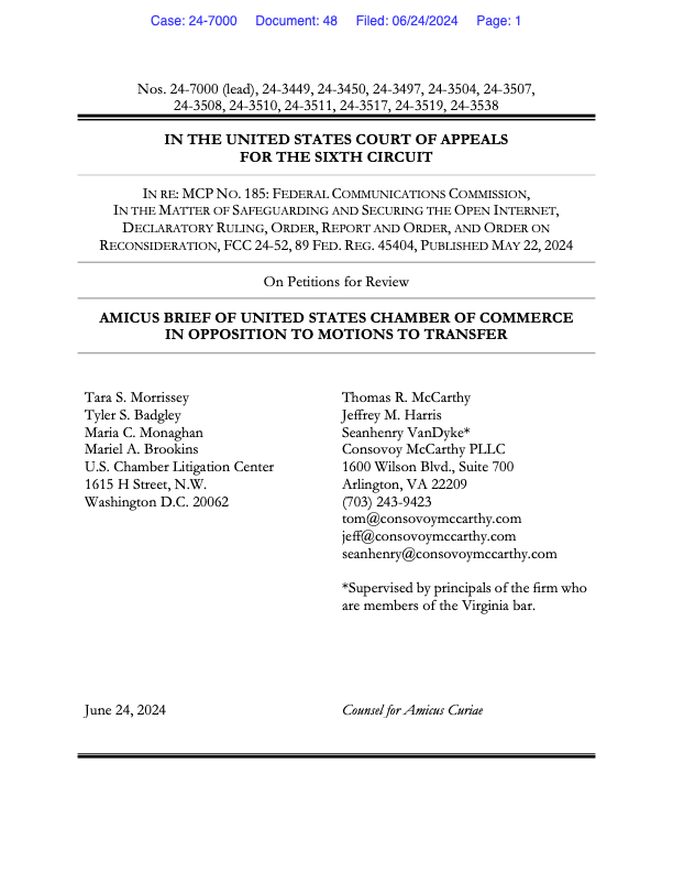 WASHINGTON, June 25, 2024 – The U.S. Chamber of Commerce joined broadband providers in asking the Sixth Circuit Court of Appeals not to move the net neutrality challenge to the D.C. Circuit.