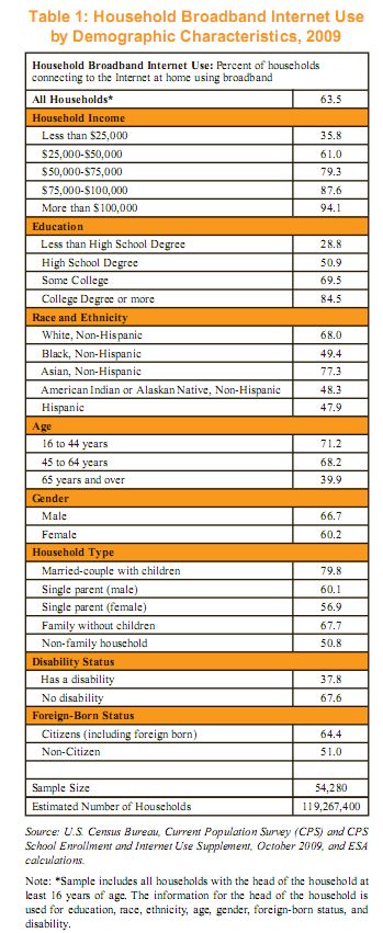 One of the more interesting findings from the report is that the divide exists mainly between rural and urban users. “Only about 28 percent of rural dwellers with incomes less than $25,000 had broadband internet at home, compared to 38 percent of their urban counterparts and 86 percent of their high-income rural counterparts. A similar pattern holds for demographic groups defined by race, ethnicity, and education.”