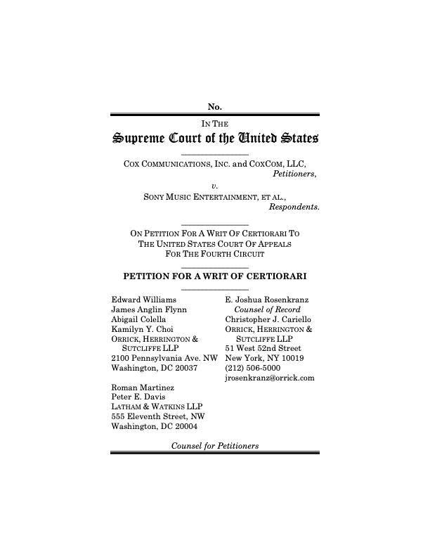 Cox Asks SCOTUS to Reverse Copyright Infringement Ruling