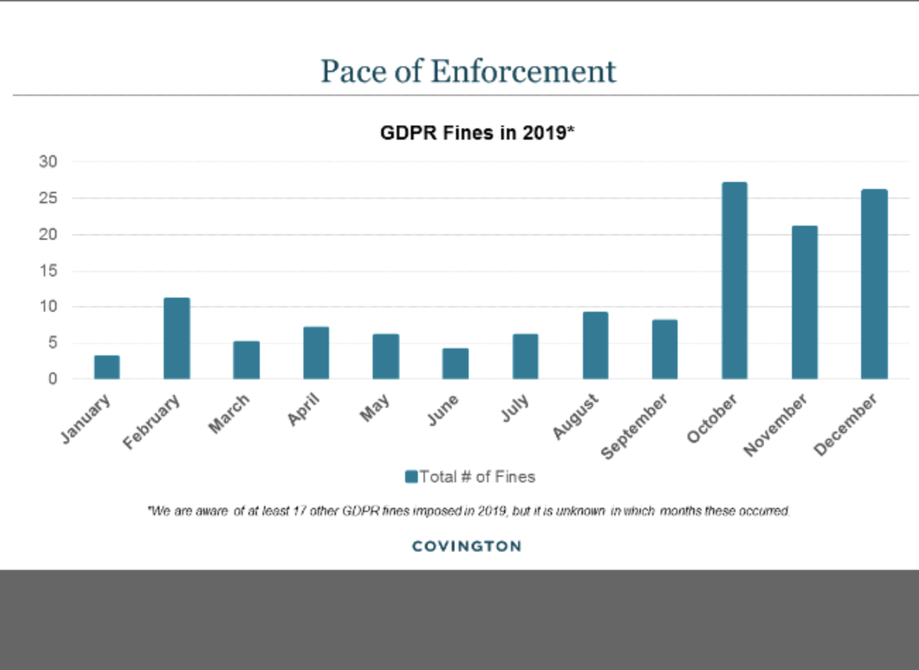 In fact, about half of the 2019 fines were levied in the last three months of the year. European businesses fear this uptick, but the data from January 2020 seems to be assuaging the fears, Cooper and Shepherd said: So far, only 9 fines have been levied in 2020.