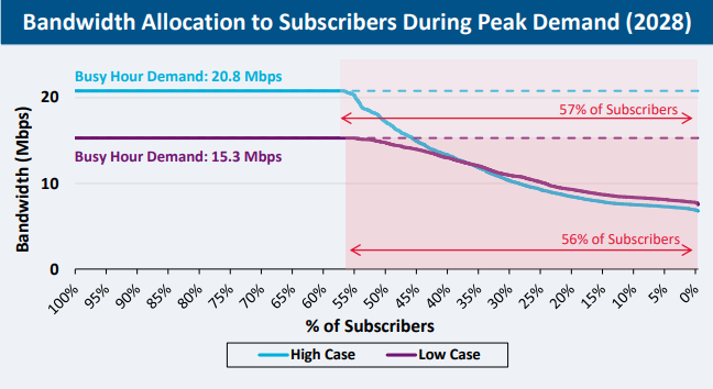 The first model assumed that during peak hours users were using 20.8 megabits per second, and the second model assumed that peak hour users were using 15.3 megabits per second. These models both found that more than half of users would experience degradation in their service.
