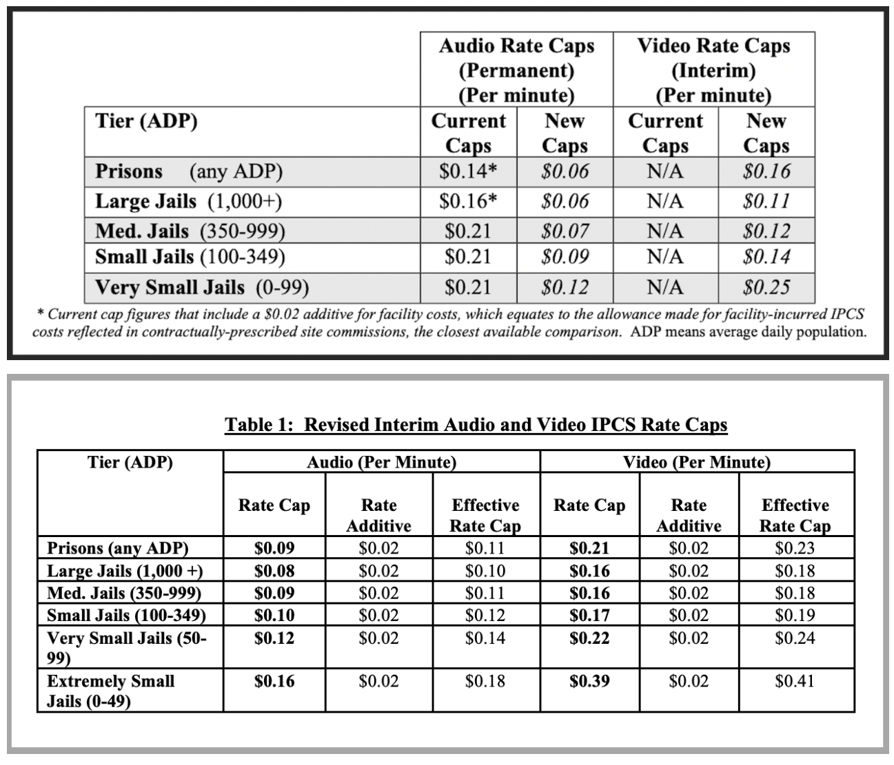 The Oct. 7 draft order would nearly double those rates. It sets new “interim” caps of $0.09–$0.16 per minute for audio calls and $0.16–$0.39 per minute for video calls, plus a new $0.02 “facility additive” tacked onto every call. For a 15-minute phone call from prison, that raises the cost from roughly $0.90 to $1.67.