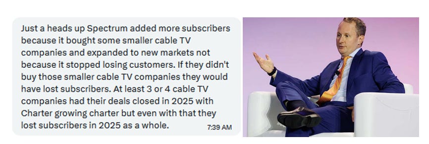 Charter: Moments after Charter’s surprising announcement Friday that it gained video subscribers in the fourth quarter of 2025, a news organization (that will go unnamed) sent Policyband a message claiming that Charter fudged its numbers. How so? Charter, the message said, failed to disclose that the 44,000 video net ads mostly came from the purchase of a few small cable systems in the quarter. “If they didn't buy those smaller cable TV companies, they would have lost subscribers,” the message said. After scrubbing the numbers, Policyband determined that the vast majority of the 44,000 net ads came from CEO Chris Winfrey’s new growth strategy of providing $129 a month worth of programing apps (including ESPN and HBO Max) to traditional cable TV customers for free. In the fourth quarter, Charter in fact added just 810 video subscribers from a single system purchase. That Charter was close to achieving positive net ads should have been obvious to anyone watching the company’s pay-video trends in recent years. In the third quarter of 2024, Charter lost 294,000 video customers; at the end of the third quarter of 2025, the loss had plunged to 70,000, setting up the 4Q25 move into positive territory. (More after paywall.)