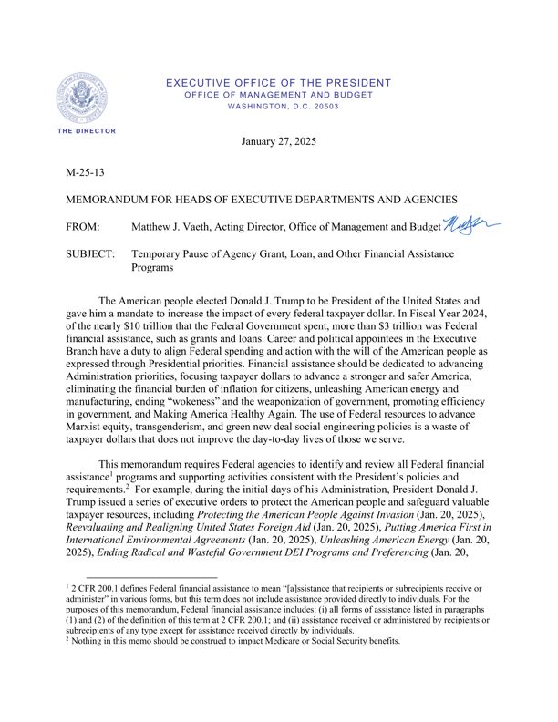 On Monday night, the White House circulated a memo directing executive agencies to pause federal grant spending until Feb. 10. “To the extent permissible under applicable law, Federal agencies must temporarily pause all activities related to obligation or disbursement of all Federal financial assistance,” read the memo, authored by Matthew Vaeth, acting director of the Office of Management and Budget.