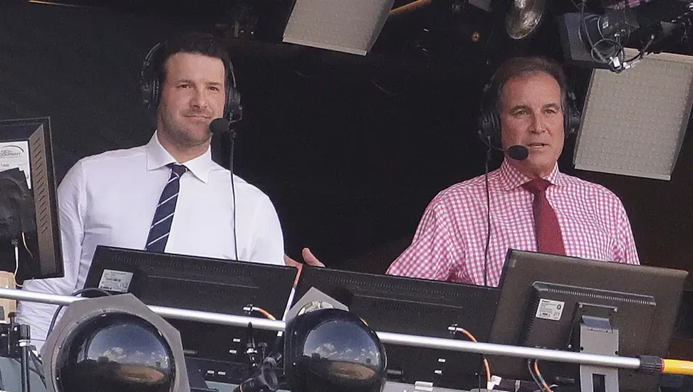 Photo of Tony Romo (left) and Jim Nantz (right), the lead NFL broadcast team for CBS Sports.