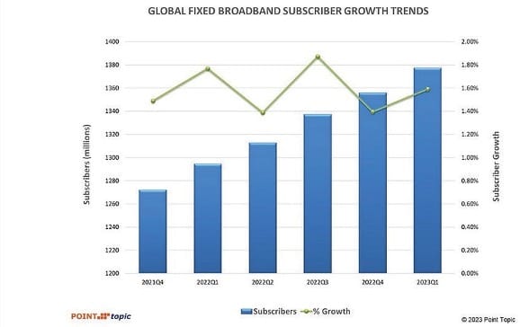 “Global Broadband Subscriptions at end-2022: Fibre Claims Two Thirds: The share of FTTH/B in the total fixed broadband subscriptions continued to increase and stood at 65.7%. Cable broadband connections followed with a 16.3% share, while ADSL fell to 8.8 and FTTx to 6.8%.”