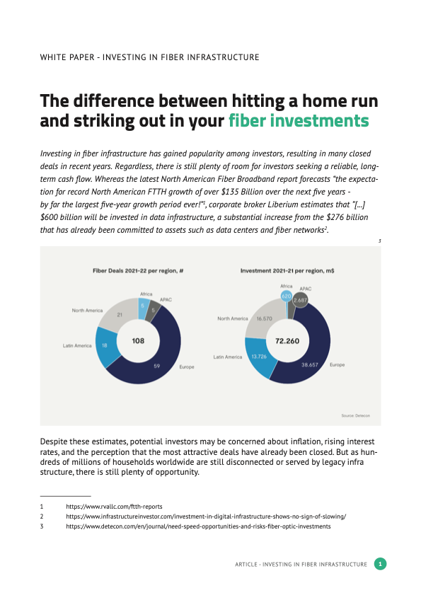 Investing in fiber infrastructure has gained popularity among investors, resulting in many closed deals in recent years. Regardless, there is still plenty of room for investors seeking a reliable, long- term cash flow. Whereas the latest North American Fiber Broadband report forecasts “the expectation for record North American FTTH growth of over $135 Billion over the next five years - by far the largest five-year growth period ever!”, corporate broker Liberium estimates that ”[...] $600 billion will be invested in data infrastructure, a substantial increase from the $276 billion that has already been committed to assets such as data centers and fiber networks.