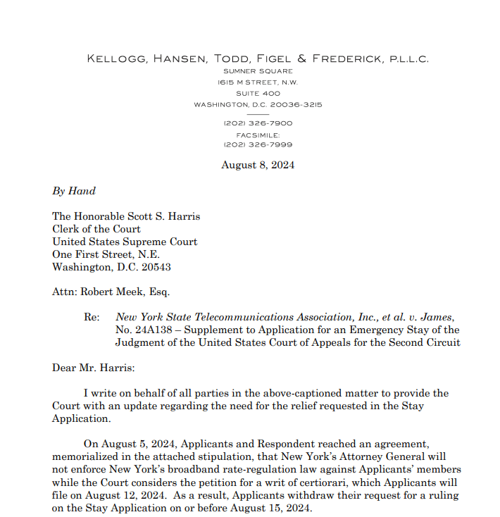 WASHINGTON, August 8, 2024 – Trade groups for Internet Service Providers plan to ask the Supreme Court next week to strike down a New York law mandating affordable broadband prices for low-income consumers.