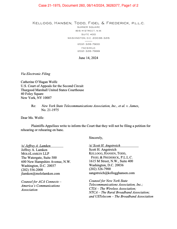 WASHINGTON, June 14, 2024 – Trade associations for Internet access providers have decided to stop fighting in federal court a New York law requiring reduced-price Internet plans for low-income consumers.