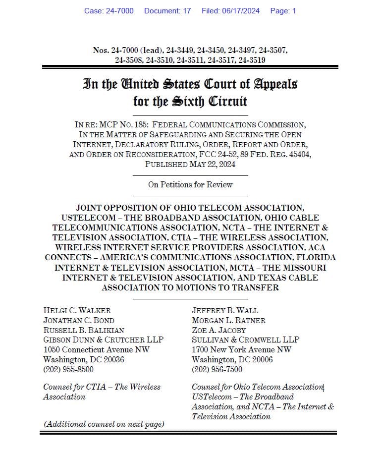 WASHINGTON, June 18, 2024 – Internet Service Provider trade associations don’t want their net neutrality lawsuit to leave a Cincinnati courtroom.