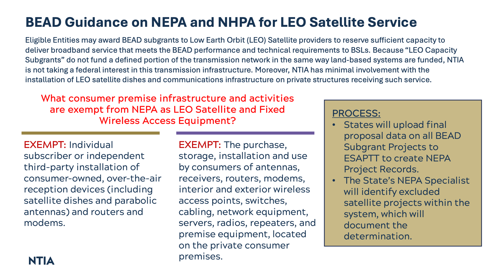A category of project that’s entirely exempt from environmental reviews is the installation of low-earth orbit satellite dishes. About 20 percent of BEAD-eligible locations are in line for the service, based on states’ tentative awards.