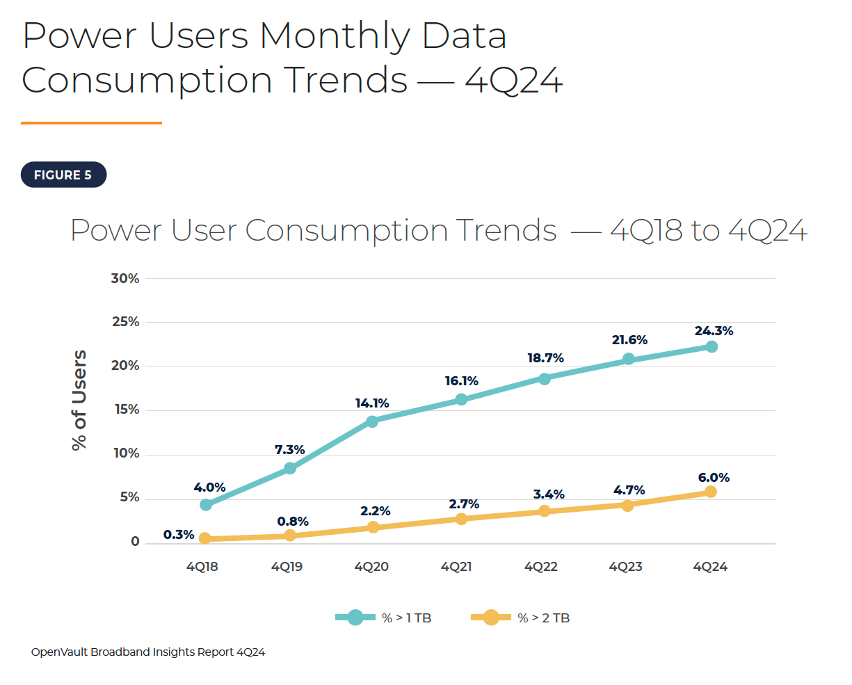 WASHINGTON, Feb. 27, 2025 – The percentage of Internet subscribers using at least 1 TB of data per month – or Power Users consuming the equivalent of 250 movies in HD – has more than tripled in the past five years, according to the latest edition of the OpenVault Broadband Insights.
