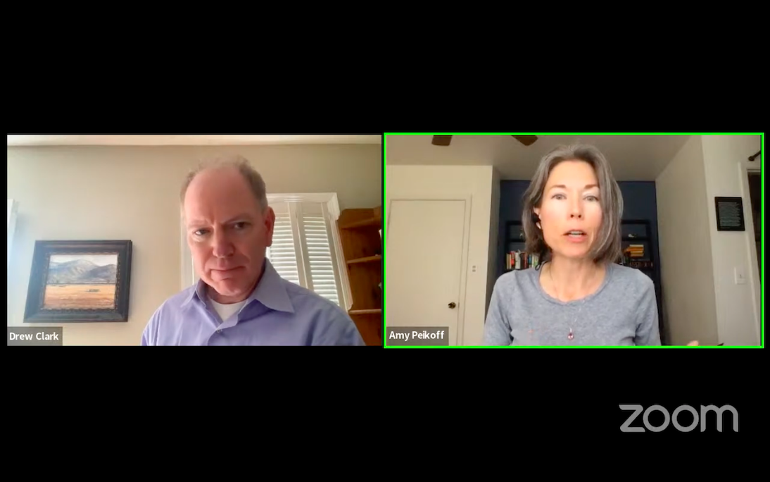 Screenshot of Drew Clark and Amy Peikoff during Wednesday’s Broadband Breakfast’s Online Event