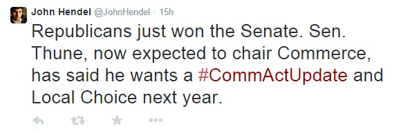 WASHINGTON, November 7, 2014 — In the wake of the Republican victory in the Senate on Tuesday, some see tech policy as one area for the party to deliver on the rallying cry of post-partisan compromise, commented TechFreedom President Berin Szoka. Tech policy issues like net neutrality has been the biggest tech issue of the year, yet, as the Washington Post points out, no one campaigned on it.Szoka, whose group is a determined opponent of net neutrality regulations, urges Republicans to rally conservative faithful against public utility regulation of telecommunications companies under Title II of the Communications Act. “The New Democrats of the 1990s opposed Title II and so did 74 House Democrats when the FCC floated the idea in 2010.”How can opponents of Title II regulation get their way?There are two paths they could take.One would urge the Federal Communications Commission to use of Section 706 to implement the protections for which net neutrality advocates have asked. Even Verizon Communications, which in January succeeded in getting the D.C. Circuit Court of Appeals to throw out the FCC’s Open Internet Order of 2010, announced their support for Section 706 in an open letter to Sen. Patrick Leahy, the National Journal reported.The other route would be wholesale revisions of the nation’s communications laws.“If we rewrote the whole [Telecommunications Act], we could get rid of a lot of outdated regulations that don’t fit, but we could build in some consumer protections,” said Phil Kerpen, president of the free-market advocacy group American Commitment.Republicans and conservative activist groups see telecom laws as outdated. On Capitol Hill, House Energy and Commerce Committee Chairman Fred Upton, R-Mich., who bested his Democratic challenger, and Communications and Technology Subcommittee Chairman Greg Walden, R-Ore., have led the push to update the Telecom Act with their #CommActUpdate campaign. The pair have been trying to rally bipartisan support through a series of meetings and idea labs in October. The likelihood of an updated Communications Act seems appears to be greater with Republican control of both houses.