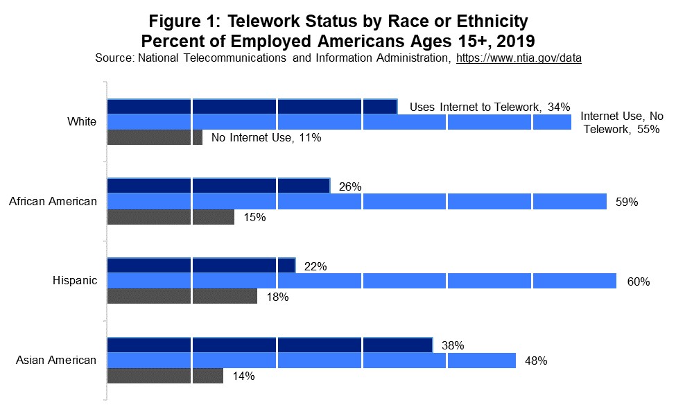 Past NTIA surveys have shown disparities in teleworking by race: there were less teleworkers reported to be African American or Hispanic. This trend was consistent in 2019.