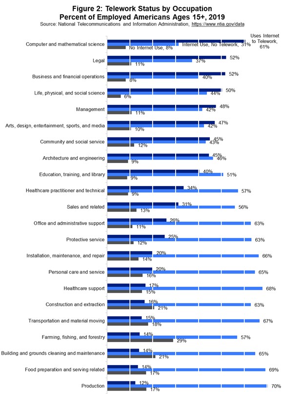Workers in professional fields, including scientific, legal, and finance fields were the most likely to telework, the NTIA reports. Indeed, more than half of those employees said they worked remotely in 2019.