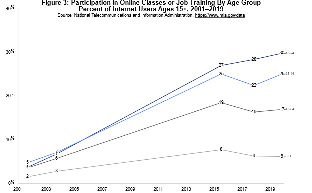 “For example, 30 percent of internet users between the ages of 15 and 24 reported taking online classes or job training in 2019, compared with just 6 percent of those 65 and older,” said Goldberg.