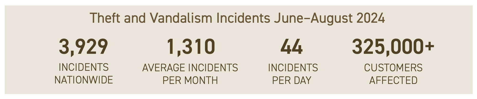 A survey of large and small communications companies across the country for incidents during a three-month period this year (June-August 2024) reveals there were 3,929 reported incidents of intentional acts of theft and/or vandalism of communications infrastructure nationwide, averaging 1,310 per month or 44 incidents per day. Eight states accounted for 73% of the reported theft and vandalism incidents over this period, with California and Texas alone accounting for 52% of these incidents. The incidents collectively affected more than 325,000 customers and cost communications providers millions of dollars in repair costs.