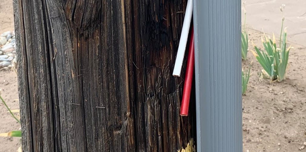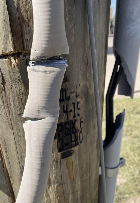 Left: Successful cuts and theft of wire in equipment cabinet. Center: Cuts to wires on utility pole in conduit. Right: Cuts to wires on utility pole in cabinet.