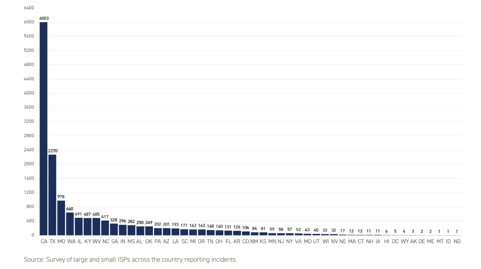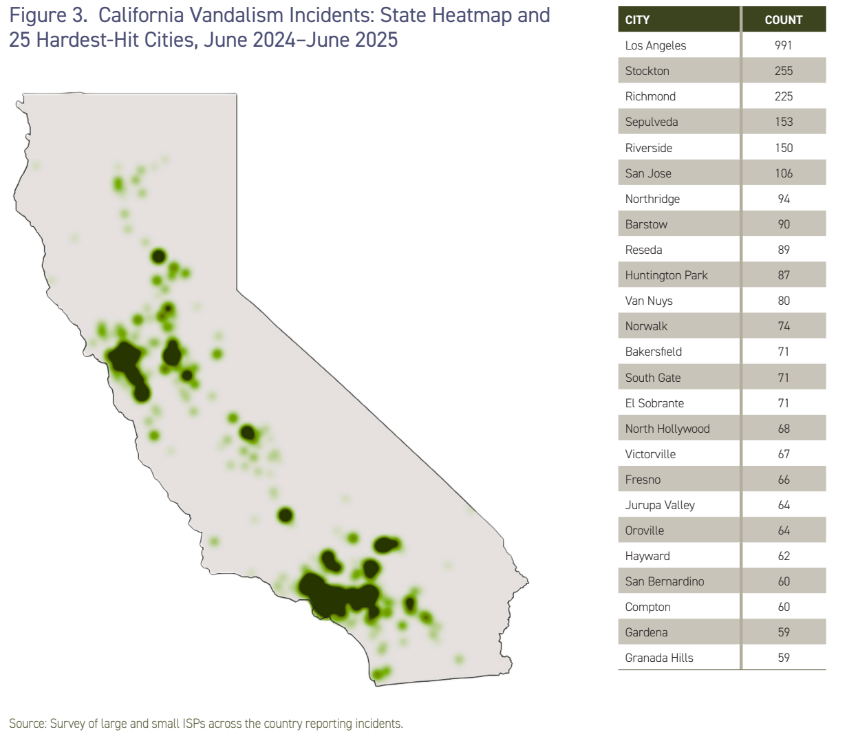 Between January and June 2025, communications companies across the country reported 9,770 incidents of intentional theft and/or vandalism targeting their infrastructure—an average of 1,297 per month, or 43 incidents each day nationwide. Just ten states accounted for 80% of these attacks, with California and Texas alone accounting for over half (53%). Together, these incidents disrupted service for over 9.5 million customers and forced providers to spend millions on repairs.23 This concentration of activity highlights where coordinated action—by law enforcement, legislators and industry—can have the greatest impact in