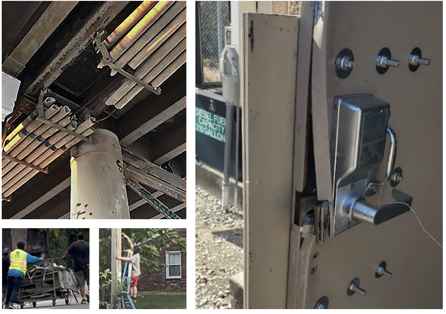 Left: Vandalism of wire conduit on utility pole. Center: Underground wire vault broken into and vandalized. Bottom right: Trailer full of stolen wires.