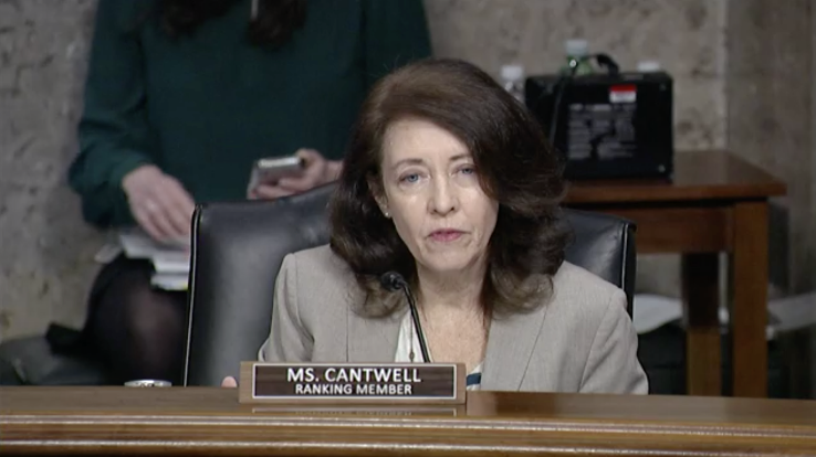 Screenshot of Sen. Maria Cantwell from a Senate Commerce hearing in May 2020