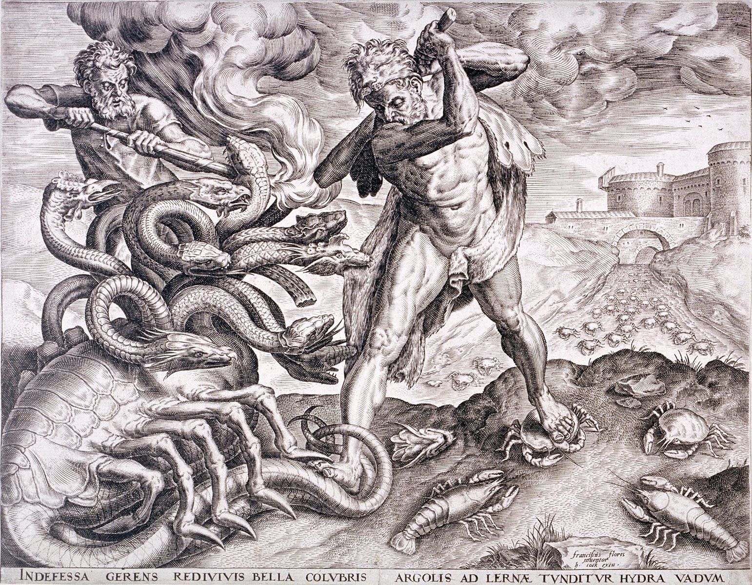 Engraving of Hercules battling the hydra