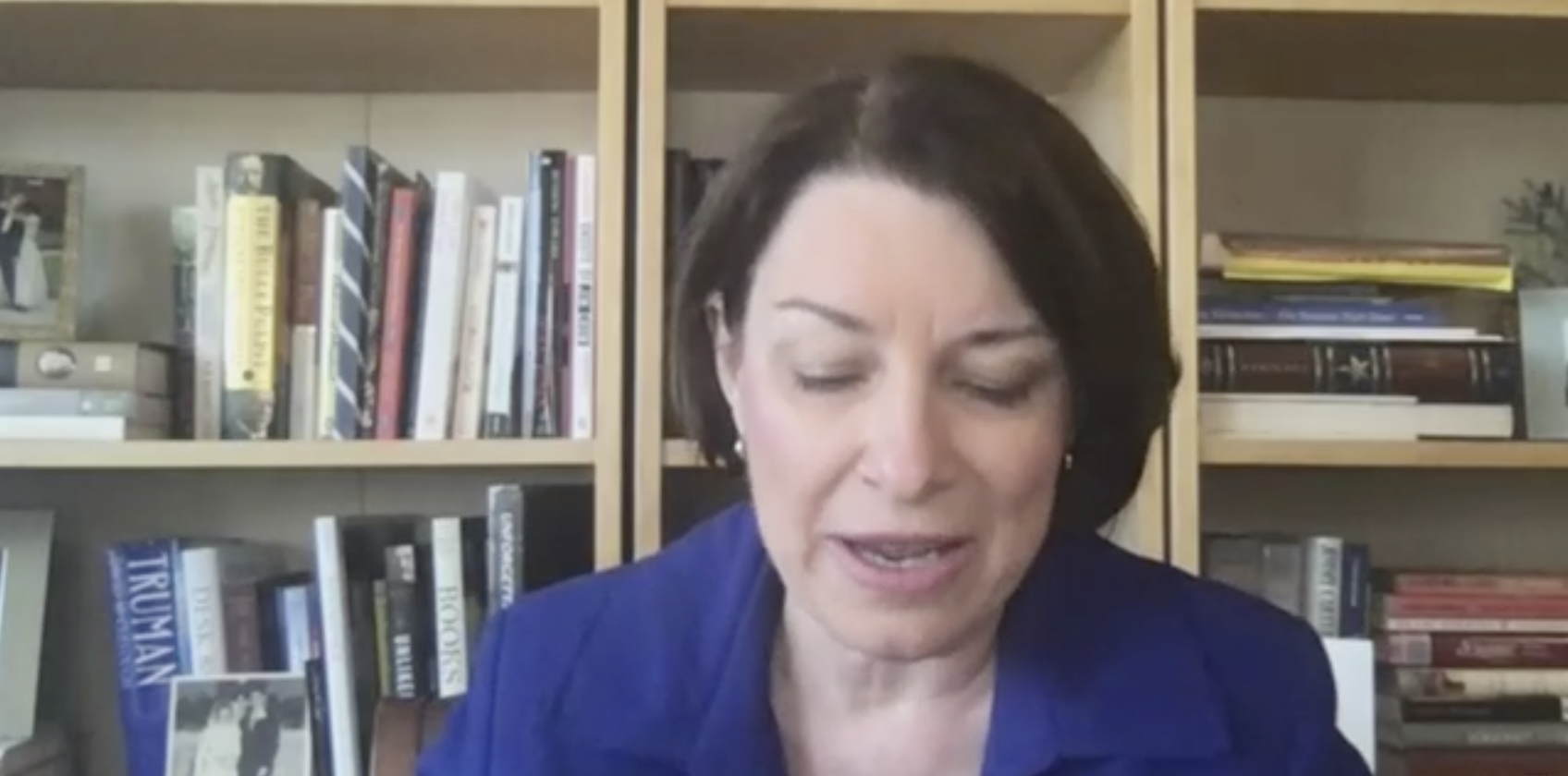 Screenshot of Sen. Amy Klobuchar participating in the hearing remotely