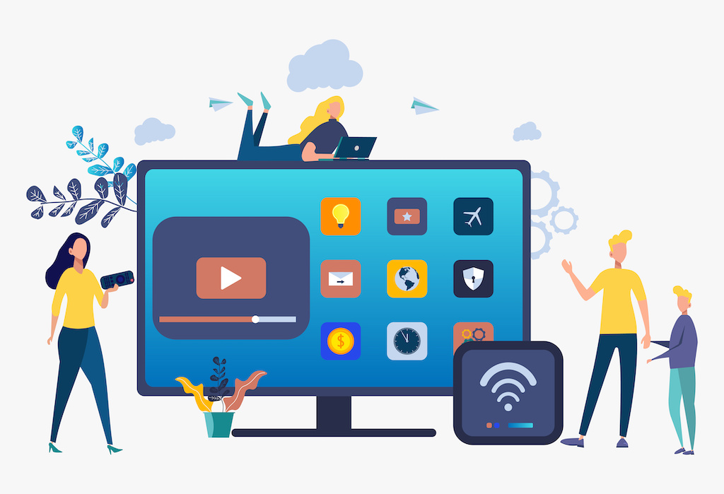 People watch videos with a remote control and a television multimedia box. Television console, smart set-top box.