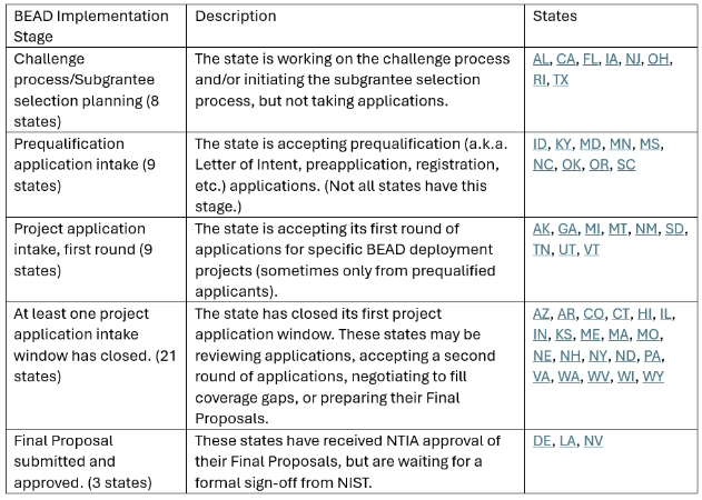 While many state broadband office websites contain outdated language, perusal of web pages and guidance documents suggests the following classification of where states are currently in terms of broad BEAD implementation stage: