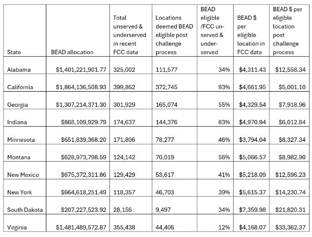 - Most to all states seem to have experienced a reduction in the reach of BEAD eligibility as a result of the challenge process. This was not necessarily anticipated, since non-eligibility could also be challenged. It was widely suggested that ISPs overreport coverage in the FCC maps, and local governments and community organizations had an opportunity to demonstrate that the maps overstated coverage and additional locations should be BEAD eligible. Some did, but far more changes went in the other direction, removing locations from BEAD’s target list.