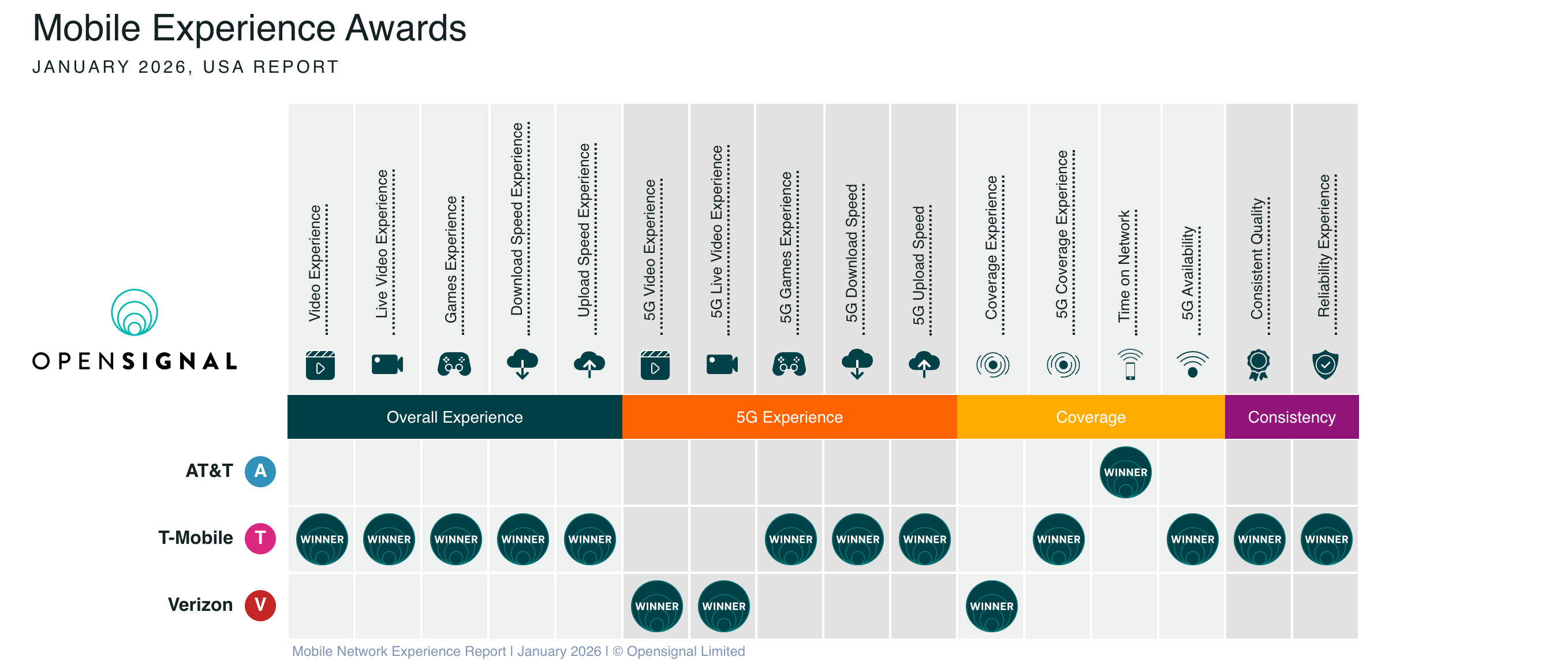 WASHINGTON, Jan. 12, 2026 – T-Mobile continues to lead U.S. mobile network performance, outperforming Verizon and AT&T in key reliability and consistency metrics, according to Opensignal’s January 2026 Mobile Network Experience Report.