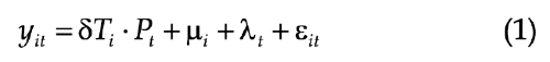 where yit is the outcome in county i and time t, Ti measures the deployment of 5G services, Pt is a treatment indicator, μi is a county fixed effect, λt is a year fixed effect, and εit is a random disturbance term. The treatment variable Ti is continuous. Standard errors are clustered at the county level.