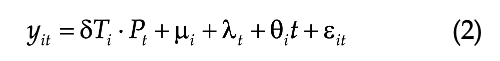 where the θit are county-specific time trends.[7] Including county-specific linear trends addresses the parallel paths assumption problem by allowing each county to follow its own growth trajectory over time, rather than requiring all counties to follow parallel trends before the 5G deployment. These county-specific time trends adjust for pre-existing differences in growth trajectories between counties that received more intense 5G deployment and those that received less, relaxing the strict parallel trends assumption and making the estimate of δ more credible. This specification assumes that linear trends account for differences in the paths of the outcomes.