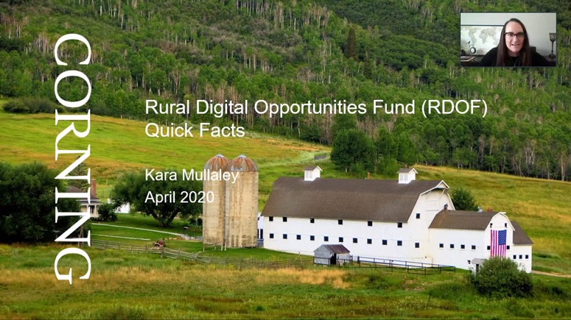 April 20, 2020— There are aspects of fiber-optic cabling that make the Rural Digital Opportunity Fund auction “very favorable” to the technology, said Kara Mullaley, a market development manager at Corning Optical Communications at a webinar hosted by Corning on Thursday. The Rural Digital Opportuni