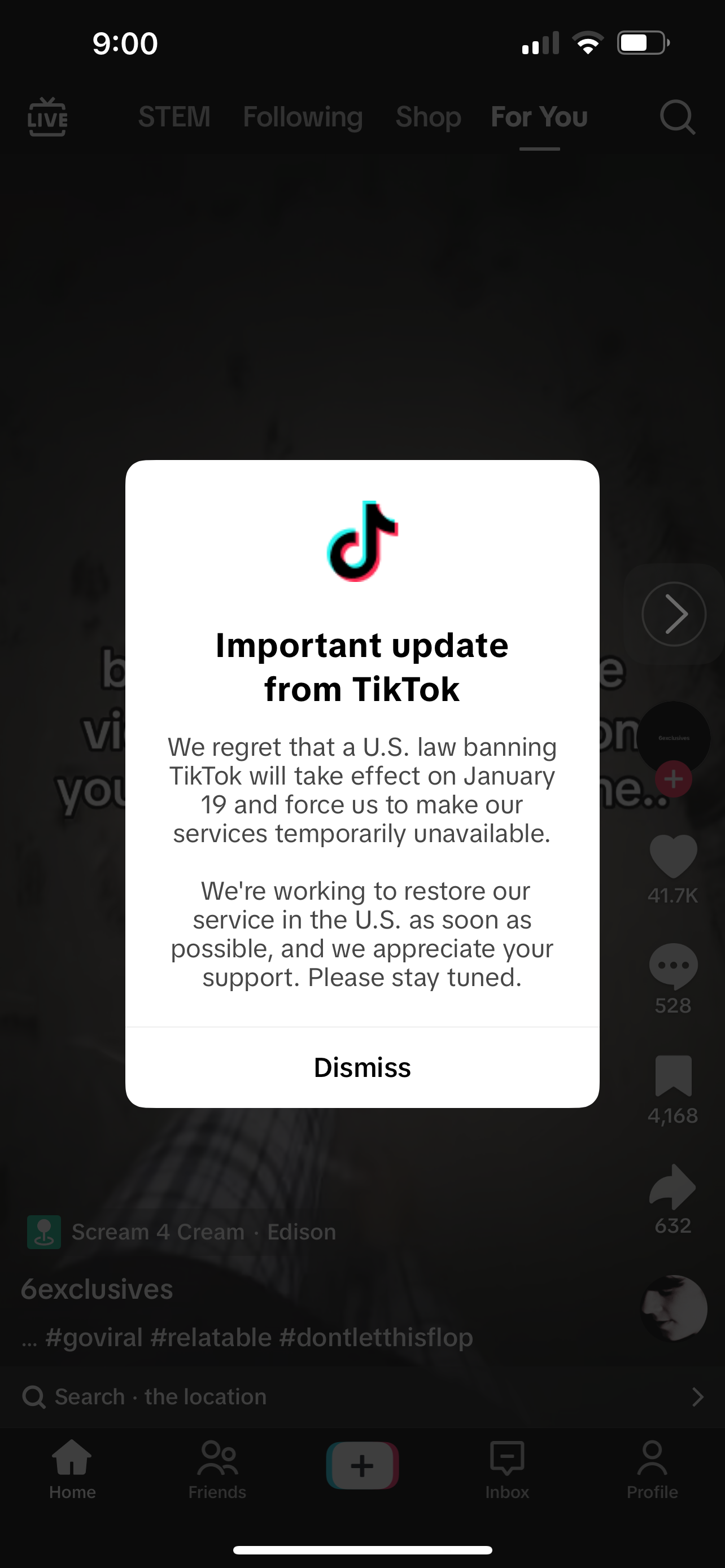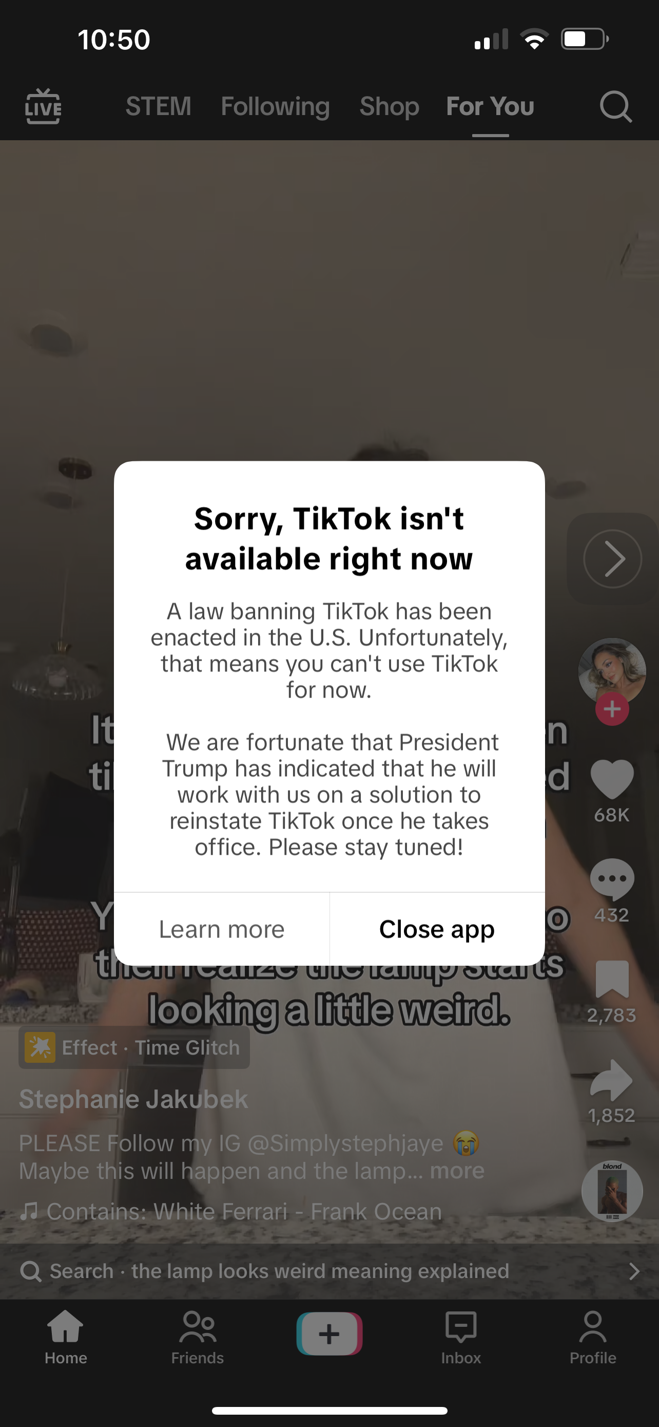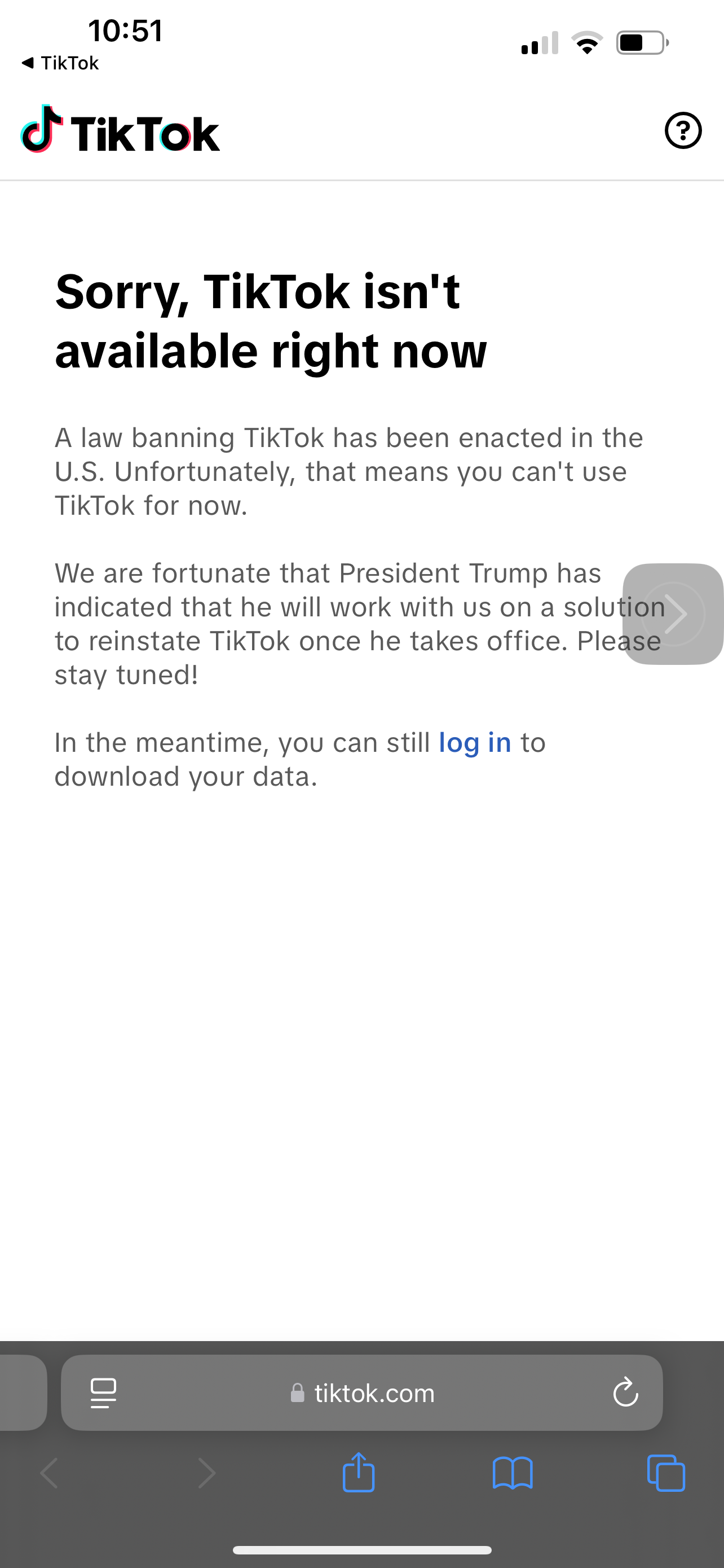 A law banning TikTok has been enacted in the U.S. Unfortunately, that means you can't use TikTok for now. We are fortunate that President Trump has indicated that he will work with us on a solution to reinstate TikTok once he takes office. Please stay tuned!