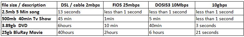 This superfast speed may seem unnecessary to some but with the increasing demand for high definition video, video chat, and the eventual expansion of 3D television the current levels of bandwidth are not fast enough. The chart below describes the time needed to download various file types.