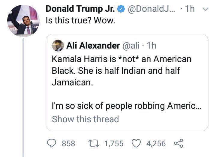 While Trump Jr. promptly deleted the tweet, the suggestion that Harris was not authentically African-American was condemned by many of her fellow primary candidates, many of whom said the attack was reminiscent of the “birther” movement which questioned whether former President Barack Obama was an American citizen.