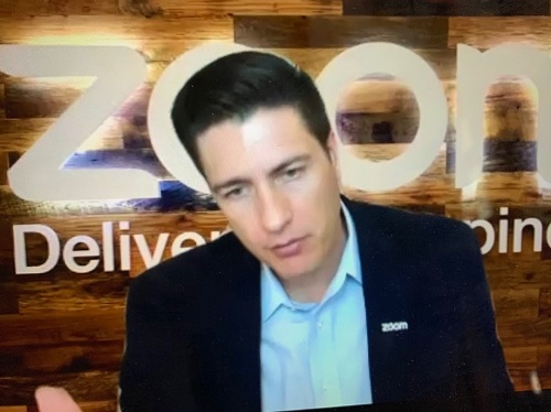 Zoom Sales Leader Colby Nish with company logo in the back: “Delivering happiness”